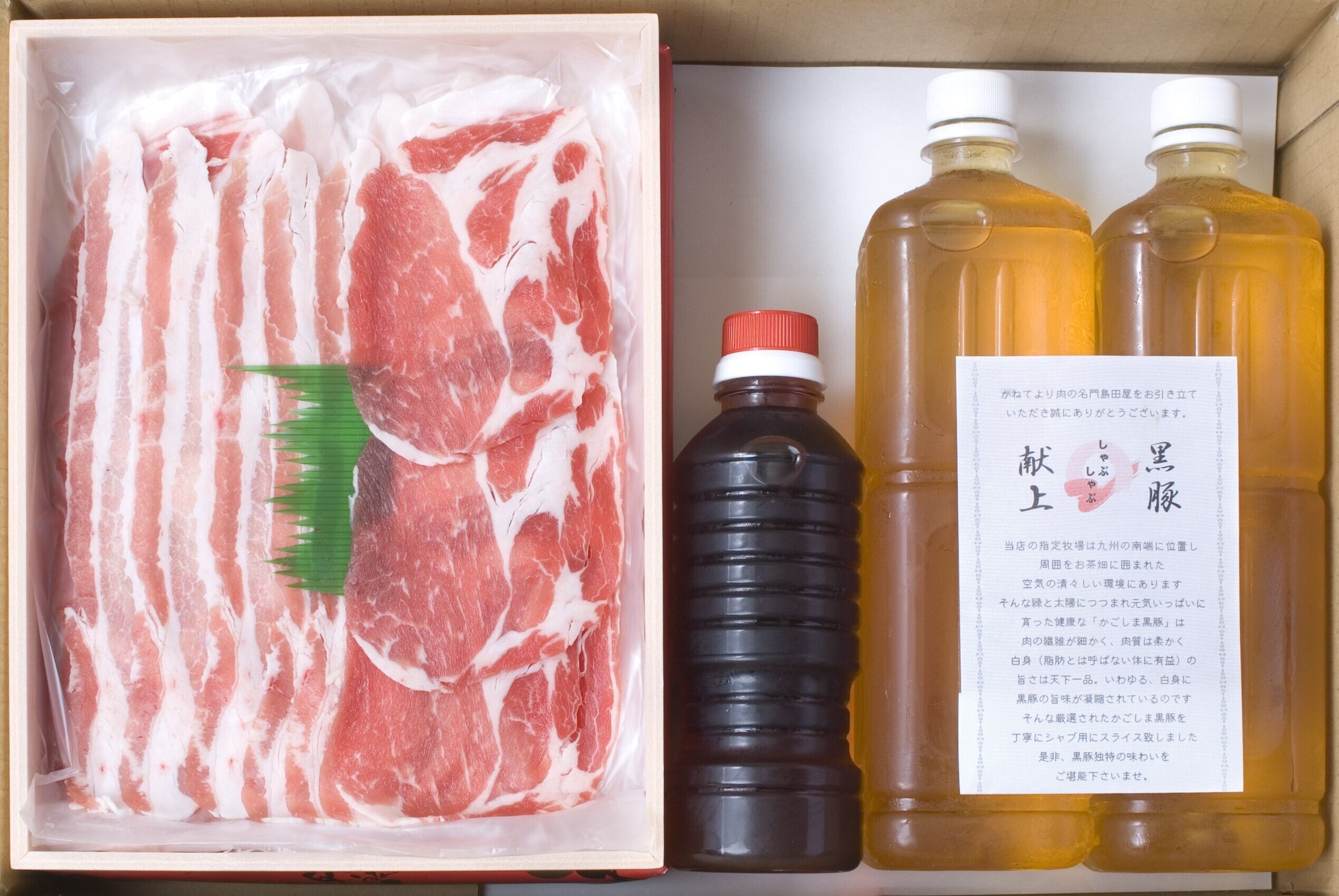 鹿児島県産黒豚のロース300gとバラ300g、出汁2L、タレのセット商品です。